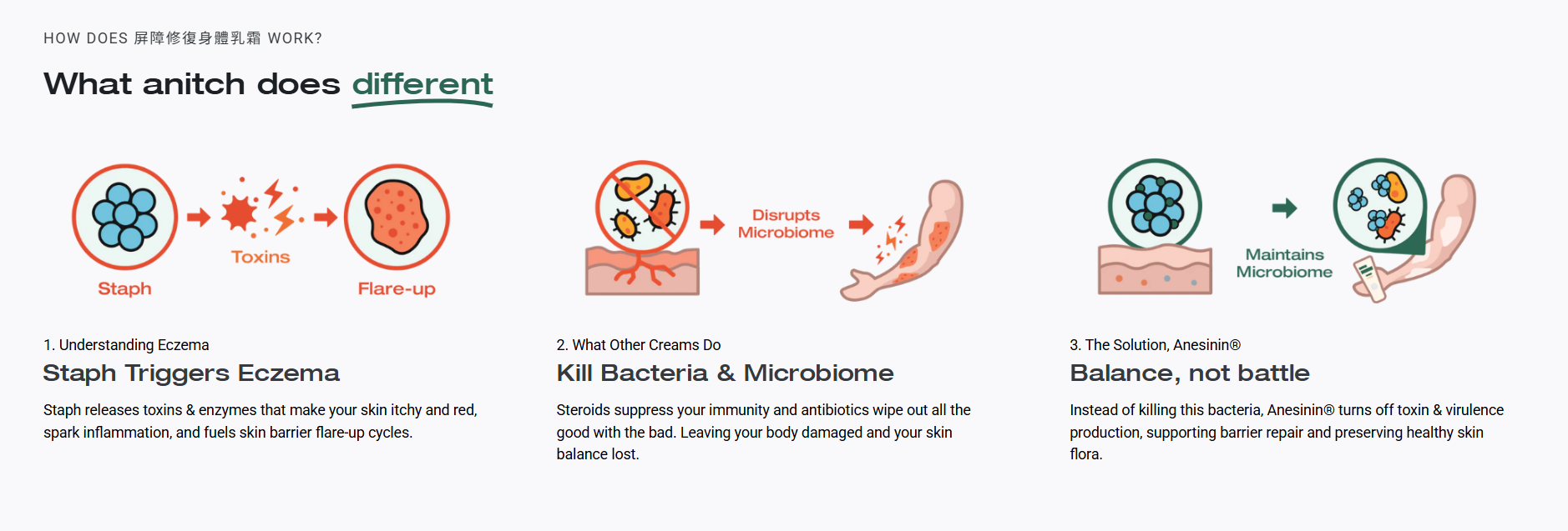 ANESININ® - 我們獨有的天然專利配方,為濕疹性皮膚提供強效修護,幫助強化肌膚屏障(微生物群),抑制有害的金黃葡萄球菌,重拾肌膚的天然柔軟與健康。