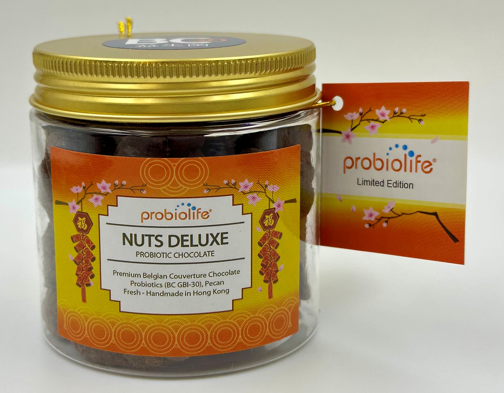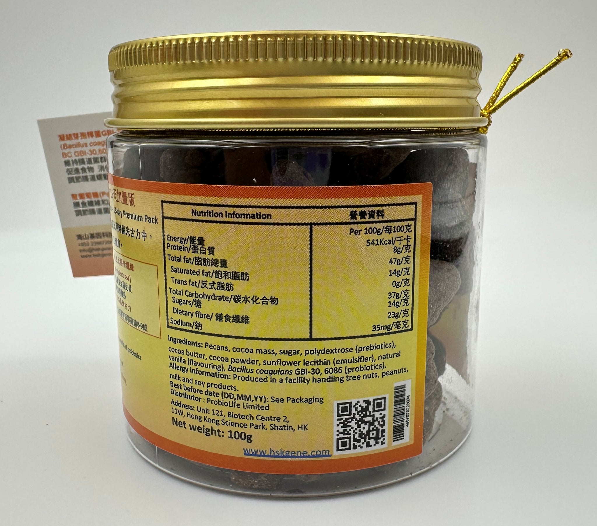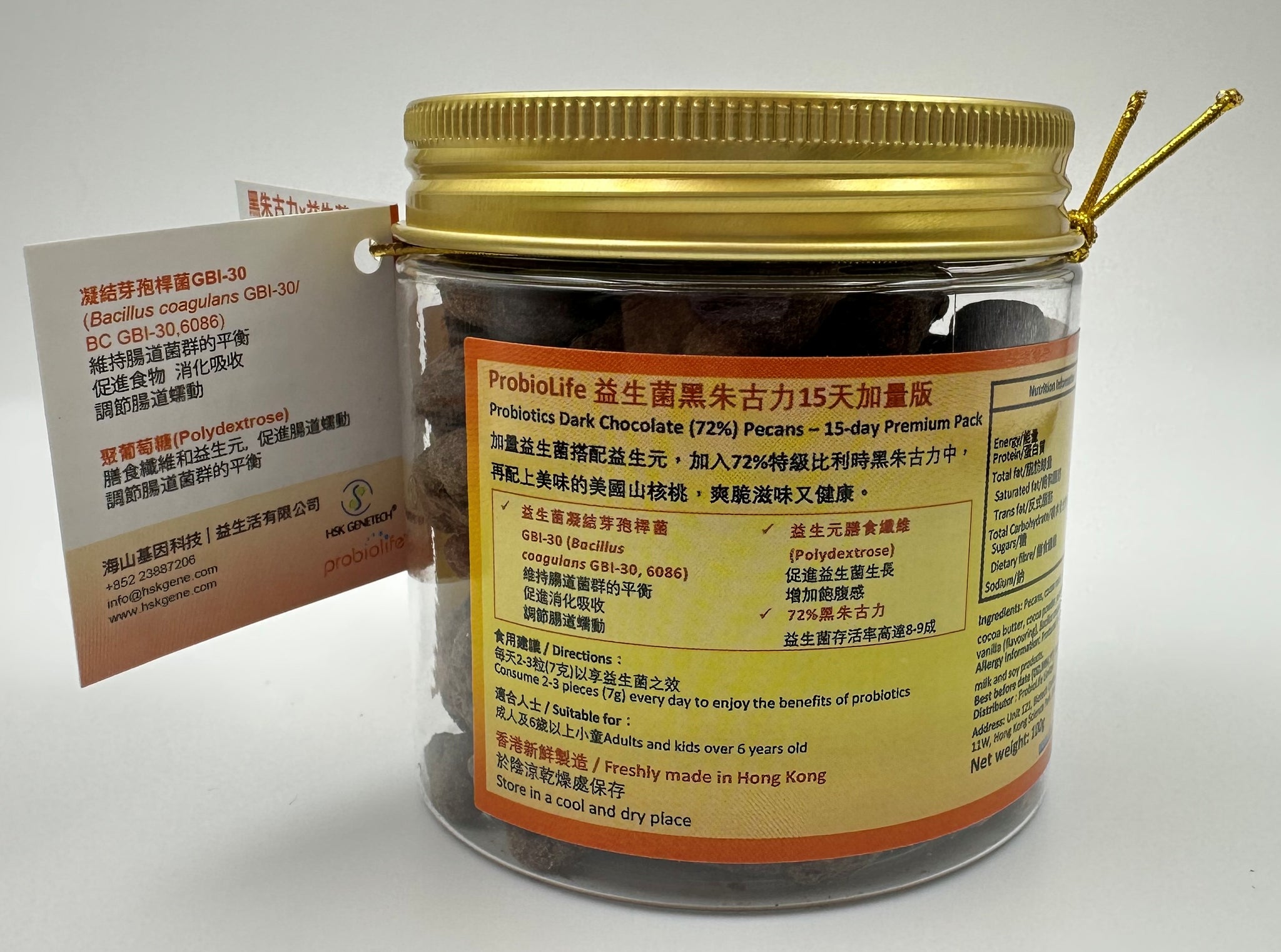 益生菌(芽孢乳酸菌 BC-30)加入72%特級比利時黑朱古力中,再配上美味的美國山核桃及有助益生菌於腸道內繁衍的益生元,爽脆滋味而健康,限時供應!